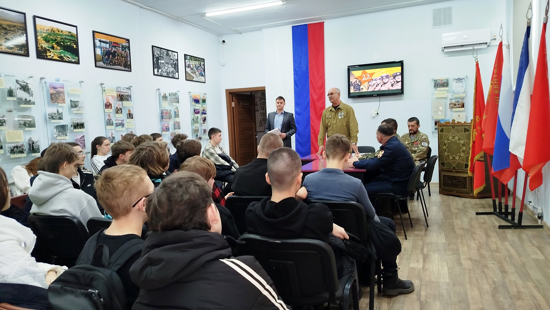 Ко Дню воинской славы России – Дню защитника Отечества в Музее современной военной истории (отдел Евпаторийского краеведческого музея) состоялась тематическая встреча «Есть такая профессия – Родину защищать». На мероприятие были приглашены учащиеся 8-А и 8-Б классов МБОУ «Средняя школа № 2 имени Героев Евпаторийского десанта» (преподаватели Мегалинская Т.Н., Джебик Е.Г., Андреева Т.Ю.).