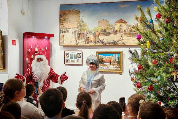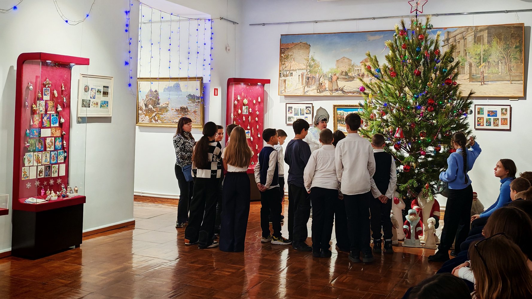 Первые экскурсии по новогодней выставке сотрудники музея провели для учащихся 5-В класса МБОУ «Средняя школа № 11 имени Героя Советского Союза Евграфа Рыжова» (руководитель Андреева Н.А.) и учащихся 3 класса МБОУ «Школа-лицей» № 3 им. А.С.Макаренко» г. Симферополь (руководитель Осолодкова Е.А.).