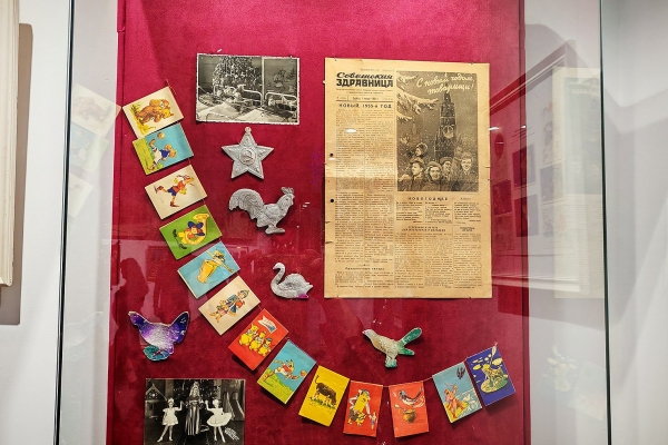 Особое впечатление на гостей произвела большая нарядная ретро-елка, украшенная новогодними игрушками 1950-1980–х гг.: елочными бусами, шарами, фонариками, снежинками, сосульками, овощами и фруктами. Под елкой, в центре зала разместилась коллекция ватных и пластиковых Дедов Морозов и Снегурочек, изготовленных в 1940-1980-х гг. из собрания музея. Всего на выставке «Новогодний калейдоскоп» представлено более 200 елочных украшений 1930-1980-х гг. и множество новогодних открыток 1950-1980-х годов. Дополняют праздничную атмосферу фотографии новогодних утренников этого же периода, на которых представлены воспитанники дошкольных учреждений и дети, проходящие лечение в санаториях города, и старые советские новогодние газеты из фондов музея.