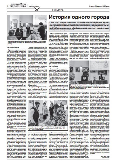 На страницах газеты «Евпаторийская здравница» 20 апреля 2023 года (№ 15), была опубликована статья О. Сергеева, посвященная научно-практической конференции «Евпатория: страницы истории», проведенной Евпаторийским краеведческом музеем к 240-летию присоединения Крыма к России.